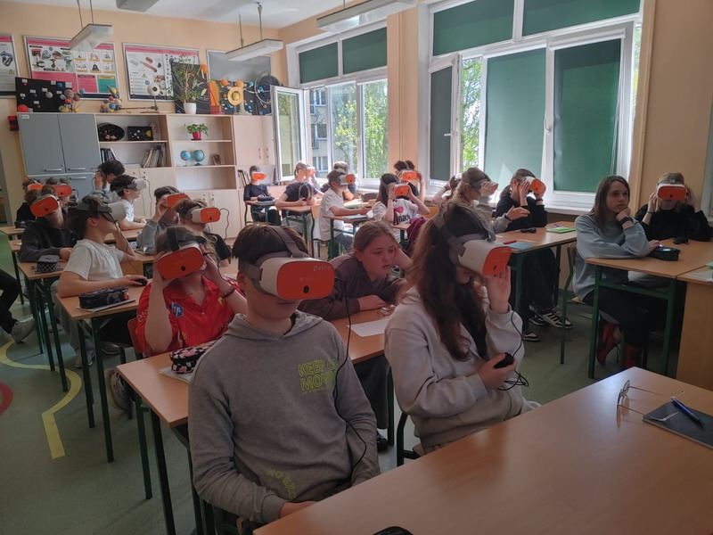 W klasie 8b tematem przewodnim była energia słoneczna, promieniowanie elektromagnetyczne i efekt cieplarniany. Uczniowie analizowali wyjątkowe warunki na Ziemi oraz rolę Słońca w obiegu energii. Gogl VR pozwoliły im zobaczyć, gdzie powstaje energia promieniowania i jak bezpośrednio wpływa na atmosferę.